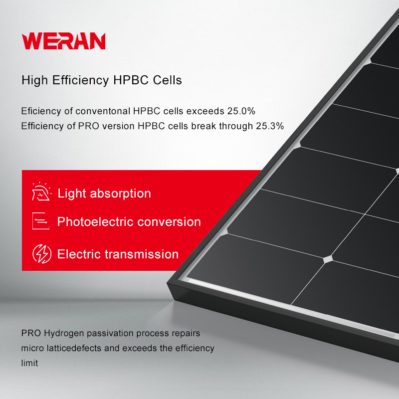 WERAN WR5-54HTB 시리즈 태양광 패널은 미니멀리스트 스타일의 올블랙 디자인이 특징이므로 주거용 옥상과 상업용 건물의 외부 표면에 설치하기에 매우 적합합니다. 이 태양광 패널의 컴팩트한 크기와 약간 가벼운 무게는 설치 중에 과도한 어려움을 초래하지 않으므로 특정 설치 비용을 낮추는 데 도움이 됩니다.